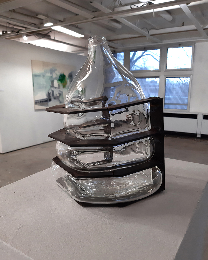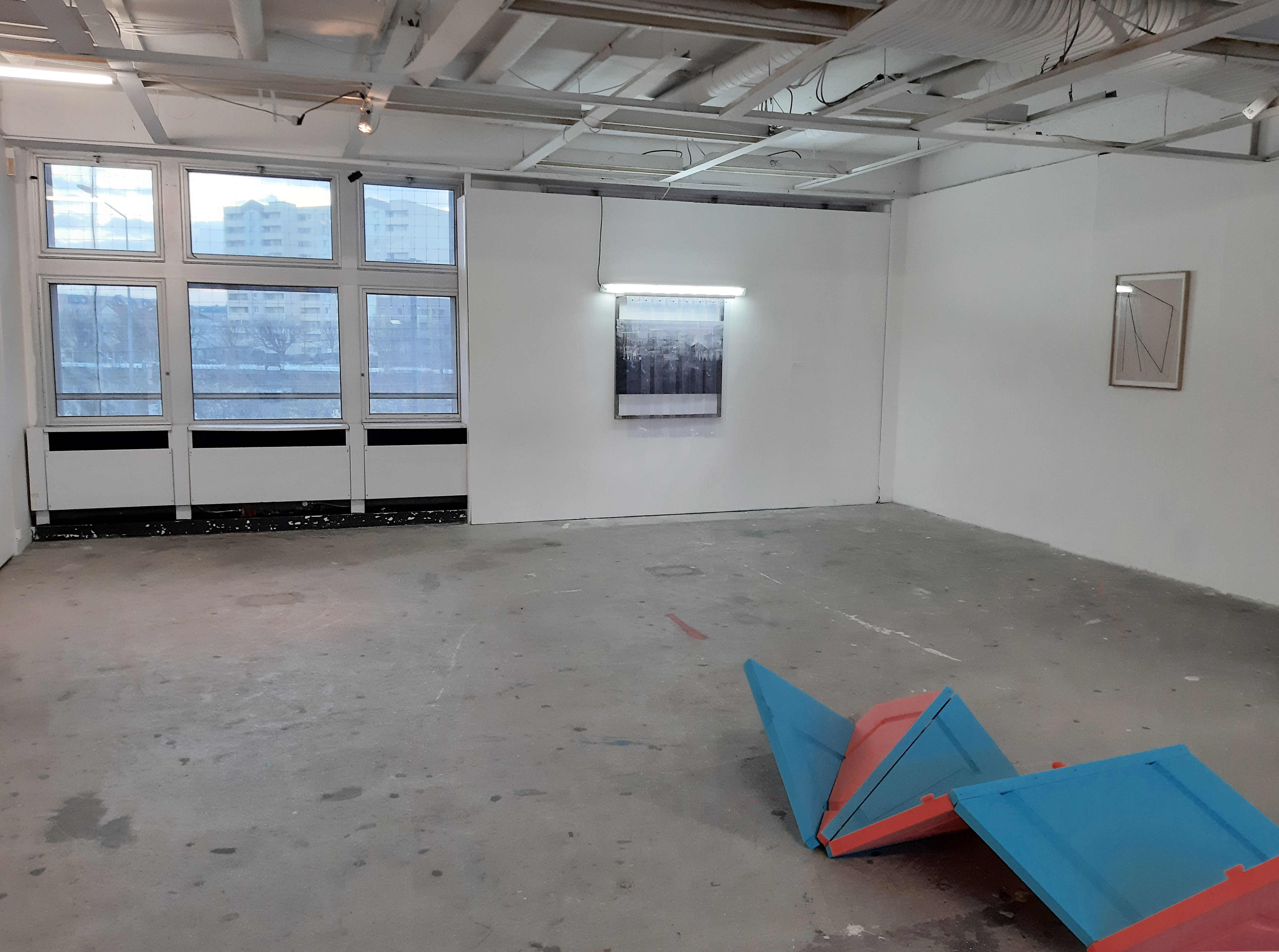 De nombreuses pièces présentées valorisent les axes, verticaux et horizontaux, mais aussi les obliques, c’est-à- dire des plans. Ces axes soulignant les arêtes structurelles et les dimensions du lieu qui les accueille, ou s’opposant au contraire à ses caractéristiques architecturales. L’ancrage des pièces dans un référentiel spatial, voire temporel et mémoriel, invite à une expérimentation physique de l’espace et des liens qui s’y tissent entre les œuvres.
